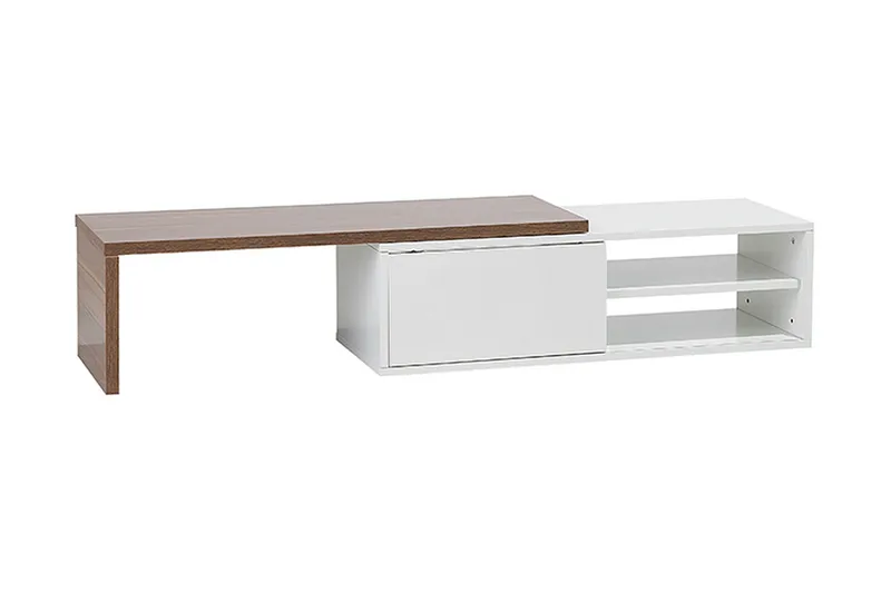 Funktionelt og rustikt tv-skab. Dette TV-bord er et justerbart element, der fuldender din indretningsvision, og det er på én gang vidunderligt moderne og ekstremt alsidigt. Skydetoppen kan flyttes, så den passer til dine behov, enten for at skabe mere overfladeplads eller for at skabe en mere kompakt komposition. Med en hvid MDF-krop og to hylder er dette møbel perfekt til opbevaring af alle dine dvd'er, spillekonsoller og tilbehør. Den friske, tofarvede finish og rene stil gør dette stativ til en fantastisk tilføjelse til enhver indretning.